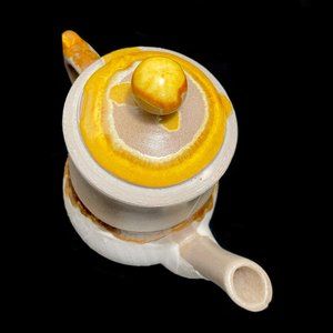 Stunning 2 Qt. Teapot in the Tundra style by Laurentian Pottery, Canada. Very rugged, Brutalist style with a thick lava drip glaze in brown/yellow/orange over dark gray for the pepper and light grey for the salt.