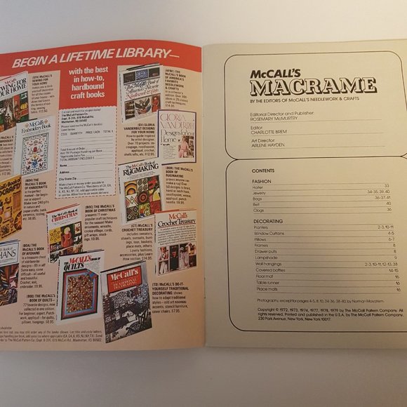 About this book - McCall's Macrame project patterns/instructions for fashion (halter, jewelry, bags, belt, clogs) and decorating (planters, window curtains, pillows, frames, drawer pulls, lampshade, wall hangings, covered bottles, floor mat, table runner, place mats)