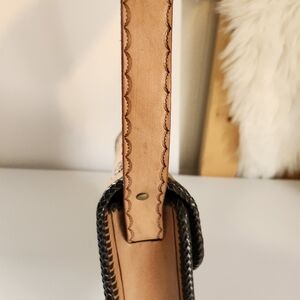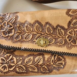 Vintage 1970s ostrich Tooled Floral Leather Shoulder Bag Purse Boho Hippie Festival 70s