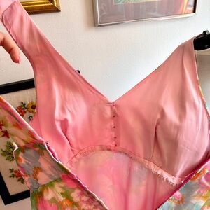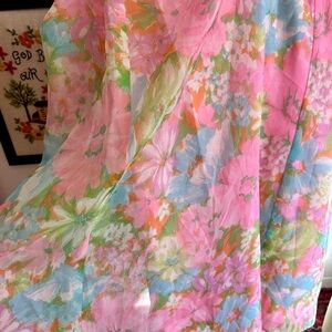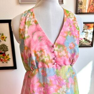Float into summer romance with this vintage 1970s pastel floral maxi dress, bursting with vibrant pinks, blues, and greens in a dreamy watercolor print.