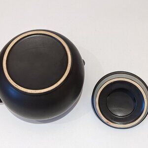 A really cool retro piece of advertising - multi purpose Planters Peanut Ceramic Crock / Cookie Jar / Bean Pot / Kitchen Storage Container has lovely black matte glaze finish with "Planters" appearing in cursive script on side. In overall good condition for age with minimal signs of wear, clean inside and out. Display lovely! Lid has rubber seal for freshness. Measures Approx. 6" tall with lid and 7.5" wide with handles.