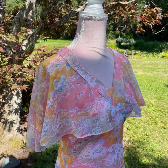 Channel dreamy retro vibes with this stunning vintage 1970s maxi dress in a swirling pastel psychedelic print. The standout feature? A fluttery capelet-style overlay that gives movement and elegance with every step.