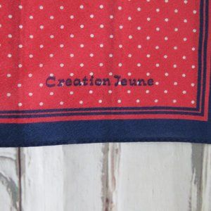 Vintage 1970s red, blue and white polka dot square scarf by Creation Jeune. This one is a beauty and a rare find. It is 100% polyester. Made in Italy. For those too young to remember, think women with curlers in their hair and the scarfs holding those curlers in place and their freshly curled hair in place with one of these lovely scarfs. Can be worn many different ways.