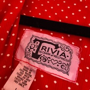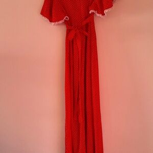 Red cotton dress with tiny white polka dots, full length, vintage peasant style dress, circa 1970's.
