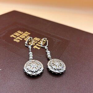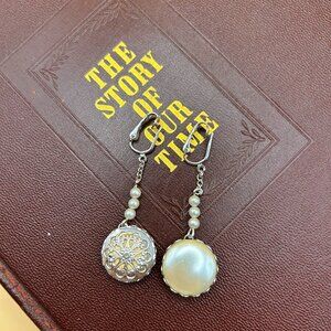 These are vintage clip-on earrings by Sarah Coventry from the 1970s. They have a leverback clip at the top, a short chain with three small faux pearls in the middle, and a larger flat faux pearl at the bottom. The back of the large pearl has a pretty silver tone metal filigree (openwork) design.