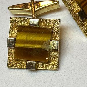Vintage 1970s Square Tiger Eye Sliver and Gold Tone Metal Cufflinks *read*