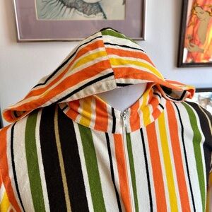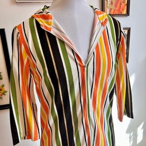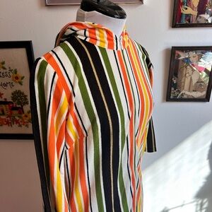 Step into sunny 70s style with this vibrant vintage maxi dress, perfect as a casual day dress or a striking swimsuit cover-up. Features bold vertical stripes in orange, yellow, olive green, black, and white for a flattering, elongating effect. The collared V-neckline and 3/4 sleeves add a tailored touch, while the full-length skirt flows beautifully for effortless comfort.