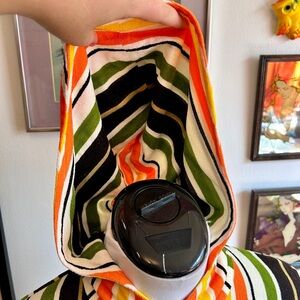 • Vertical stripe pattern in orange, yellow, olive green, black, and white