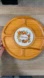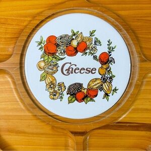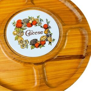 This vintage cheese serving tray features a carved wood design with four curved compartments and a rotating (lazy Susan-style) base. The center is inlaid with a ceramic tile that reads “Cheese,” surrounded by a retro fruit and nut wreath in orange, yellow, and green tones.