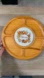 This vintage cheese serving tray features a carved wood design with four curved compartments and a rotating (lazy Susan-style) base. The center is inlaid with a ceramic tile that reads “Cheese,” surrounded by a retro fruit and nut wreath in orange, yellow, and green tones.