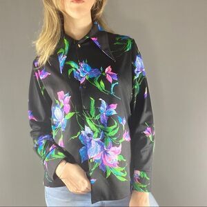Vintage Marjorie Hamilton black floral dagger collar button down top with matching tank top. 1970s classic vibes. Polyester.