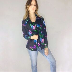 Vintage Marjorie Hamilton black floral dagger collar button down top with matching tank top. 1970s classic vibes. Polyester.