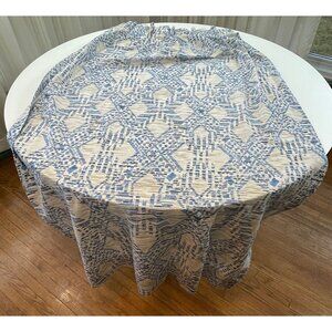Thick material, likely cotton blend, geometric print in different shades of blue, with tan and white is vibrant and shows no fading. The panels are not lined. They have a very wide hem so they could likely be lengthen if need be.