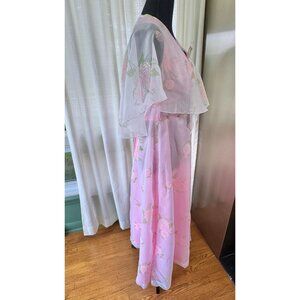 Vintage 1970s dress, pastel pink floral, capelet & train, sleeveless, open back