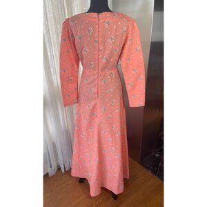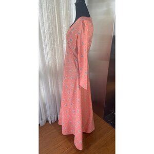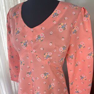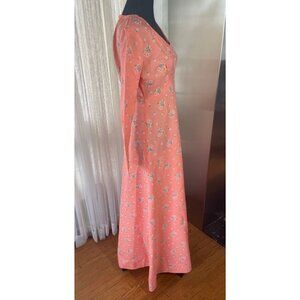 Vintage 70s handmade gown, long sleeves, floral pattern. Deep V neckline and a V shaped empire waist. Soft peach, almost coral color with delicate floral pattern in white, pink, blue and green. Material is unknown, likely polyester, feels like crepe or any other similar synthetic material.