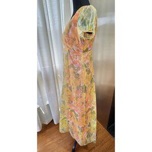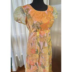 Stunning 70s vintage romantic maxi dress, sheer floral in yellow, orange, pink and green. This gown is lined but for the puff sleeves. With a scoop neckline, an empire waist, this gown is perfect for outdoor parties, weddings or even a prom.