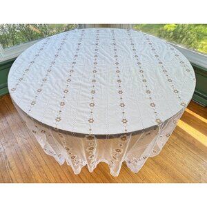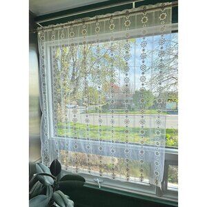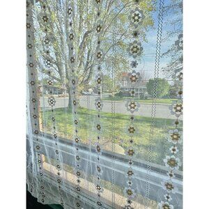 Vintage 1970s mesh curtain, white, tan groovy floral pattern, sheer panel