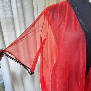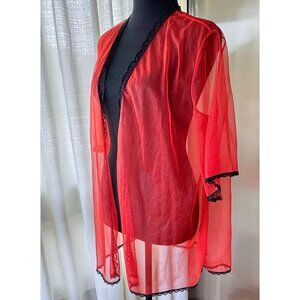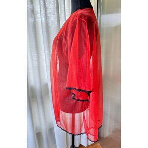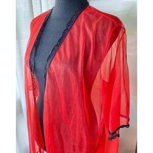 Adorable vintage 1970s peignoir, vivid red with black lace trim all over. This robe is sheer, open at the front, no closure. Length is micro, at the top of the thighs. Perfect kitsch lingerie for a boudoir photoshoot or to make an impact for a sexy look! Material is likely nylon.