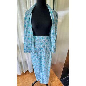 Vintage 1970s pyjamas set. Made in Canada by Lufty, brand is Clipper, this pj is a soft flannel, baby blue with floral arabesques print. The top is a button down with long sleeves, pants have an elastic waist on the back; they look roomy and comfortable!