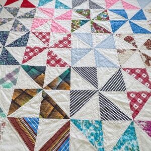 Wonderful 1970s handmade quilt, with a pinwheel pattern over a white background. Multiple colors and prints from that era are used to make this piece of art!