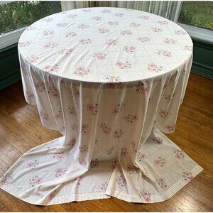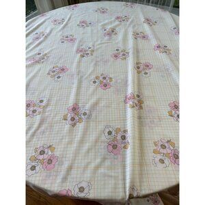 Vintage 1970s top/ flat sheet, pink peonies flowers, checkered, twin si