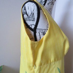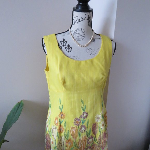 Beautiful vintage Betty Barclay Trevira Cotton yellow summer dress with embroidered floral pattern on the bottom. This one hails from the 1970s and is in excellent vintage condition. This a-line dress is fully lined with a flirty ruffle around the bottom. It has a zipper up the back of the dress. This Betty Barclay dress is a rare vintage find.