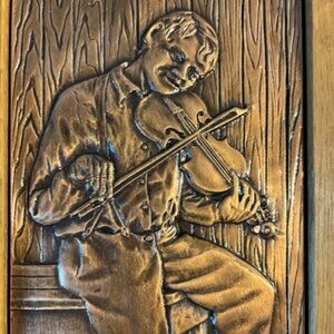 Vintage 1976 A Nadeau Quebec Canadian artist Copper embossed on wood fiddler