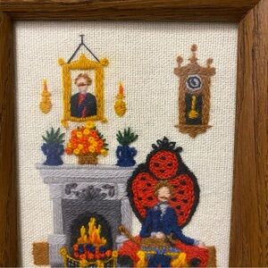 This completed Crewel is full of personality. It is a pattern from 1980. Framed in hardwood. A scene featuring a gentleman in his chair, a fireplace and portrait in the background, and the gent’s beloved kitties cuddling with him.