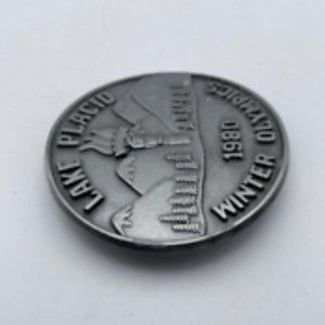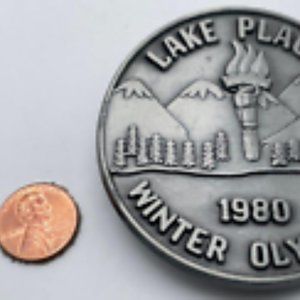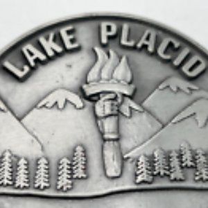 Vintage 1980 Winter Olympics Lake Placid Grey Silver Tone Mountain Belt Buckle
