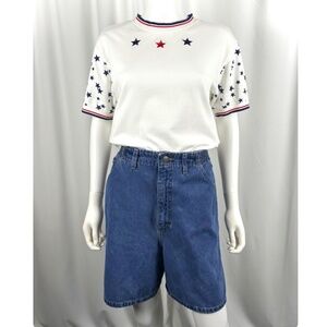 Vintage 1980’s 1990’s ‘Westbound’ Patriotic Red White & Blue Short Sleeved Tee Shirt • Star Patchwork • Striped Trim