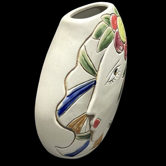 Vintage 1980s Abstract Pottery Art Vase features a unique continuous line portrait on one side, and the other showcasing a women profile surrounded by glossy vibrant floral motifs. The matte grey base is beautifully accented with red, yellow, green, blue, brown, and orange hues, adding a pop of colour to any space.