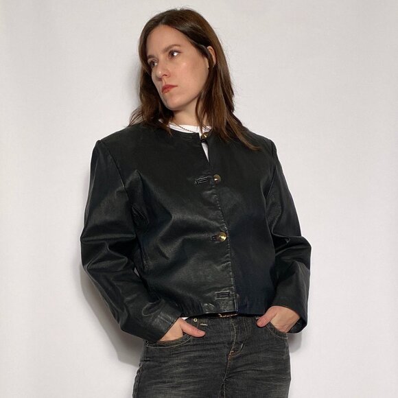 Closet tags: minimal minimalist gold buttons 80s 90s 1980s 1990s crop cropped massimo genuine real leather collarless shacket black