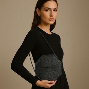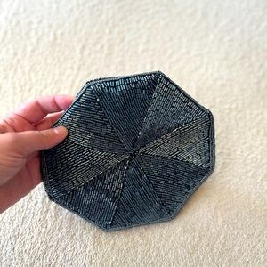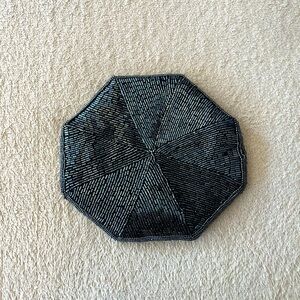 Elevate your evening look with this vintage beaded clutch from the 80s. Featuring an eye-catching octagonal shape and intricate black glass beadwork in a radiating sunburst pattern, this small bag is a unique piece of wearable art.