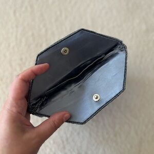 It opens to a satin-lined interior with a single compartment and snap closure, and includes a braided beaded strap for shoulder or crossbody wear. Made in China, this piece captures Art Deco revival vibes with its bold geometric style.