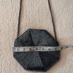 Elevate your evening look with this vintage beaded clutch from the 80s. Featuring an eye-catching octagonal shape and intricate black glass beadwork in a radiating sunburst pattern, this small bag is a unique piece of wearable art.