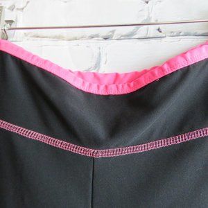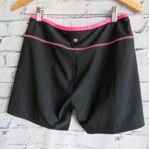 Black spandex cycling shorts with pink neon trim and stitching. These shorts were made by Heavenly Bodies, a Vancouver BC Canada company. The size is a women's Large.