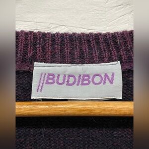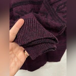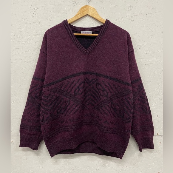 Vintage 1980s Budibon Wool Blend Knitted V-Neck Sweater, Fits L/XL. Rich maroon colour with black knitted patterns. Minor wear and pilling overall. Please see all photos and DM with any questions.