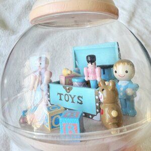 This is an adorable vintage-style music box designed to resemble a pastel pink gumball machine. Inside the clear dome, tiny wooden figurines depict a nostalgic toy shop scene, adding to its whimsical charm. The front features a decorative coin slot with a key mechanism, giving it a classic penny-operated look. this piece is perfect for collectors, vintage decor lovers, or anyone who enjoys dreamy, fairy-tale aesthetics.