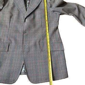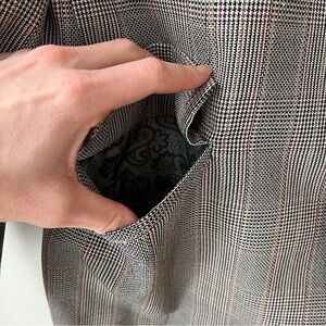 Classic vintage men’s blazer, hand tailored in Hong Kong by Impex International and custom made for “Robert M. Kennedy” in 1980. Timeless glen plaid pattern in brown, black, ivory, and red. Fully lined in a paisley satin interior with exceptional craftsmanship throughout.