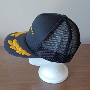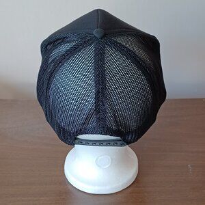Hat is in good used condition for its age. Graphic on front has minimal wear. Snaps on the back are still in good shape, as is the foam on the inside of hat. Hat is made from 100% polyester. What you see is what you get. Item is sold AS IS.