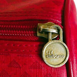 Vintage 1980;s Liz Claiborne-Red Triangle Logo-Crossbody Bag With Genuine Leather Trim. In Good, Vintage, Pre-Owned Condition. Strap Is app. 45" at Last Hole, Extends To 48". Bag Measures app. 10" x 7". Has One Inside Zippered Pocket. Hardware Accenting It Is Solid Brass. Purse Does Have Some Minor Light Ware On Outside Leather In Some Areas & Around Edges. Ware That Might Be Found Due To Age and Use. No Major Rips or Tears. A Couple Of Small Stains Inside.