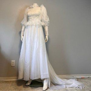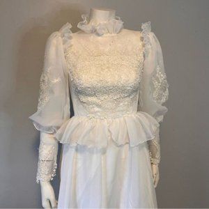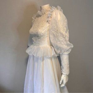 Vintage 1980s Long Puff Sleeve Alencon Lace Frill Waist Wedding Gown Size XXS