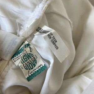 The dress closes in the back via a zipper and a series of fabric-covered buttons. The bodice leads to an a-line organza skirt. This dress is in excellent condition and is very clean. There is no Size tag on dress, see the measurements below to determine best fit.