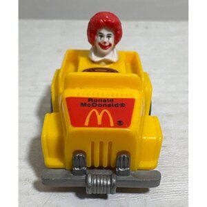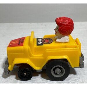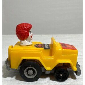 This collectible McDonald's toy car features Ronald McDonald in a yellow jeep design, showcasing iconic branding. Ideal for collectors or enthusiasts.