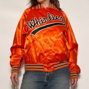 Vintage 1980s orange & black classic satin bomber with 'Whirlies' logo! Super unique and cool! Union made in Rochester N.Y. so it should theoretically be exempt from tariffs to the USA (but ya know, things keep changing....).