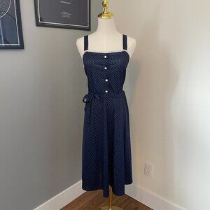Details: Step back in time with this adorable vintage Sears rockabilly pin-up style sundress. Made in a classic navy blue polka dot print with charming white swirl buttons, contrast piping, and a waist tie for a flattering fit. Mid-length with wide 1-inch straps for comfort and coverage. Stretchy and lightweight with an elastic waistband.