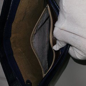 Excellent condition, navy blue leather vintage purse that can be worn over the shoulder or crossbody. The straps are removable so it can also be used as a clutch. All the leather, stitching and hardware are in top condition. There are however some pinpoint ink marks inside the purse on the suede lining. At one time there must have been an open pen in the purse. Spots easily removed by spraying with hspray and dabbing away the spot. Remember to protect the leather when doing this. The interior also has a zippered compartment on one side of the purse. It measures 10-1/2" across x 6-1/3" tall x 1/2" wide. The strap has a 19" drop. Please see my other listings. Bundle and save. Thanks for stopping by.0