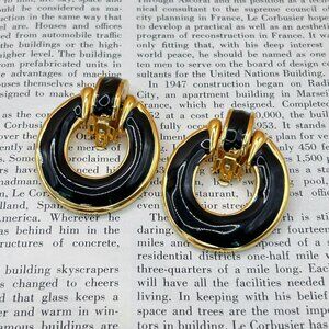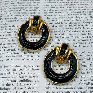 Vintage 1980s Style Statement Clip-On Earrings, Gold Tone with Black Enamel