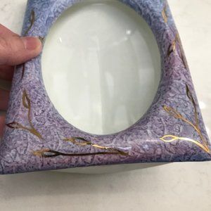 This is a beautiful rare hand painted porcelain photo frame by Tara Ireland. Signed by the artist. It was purchased in Ireland in the 1980s. The colors are so pretty with the purples and blues. Gold leaf designs in the corners and along the sides. More beautiful in person.