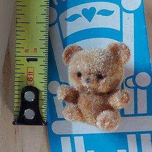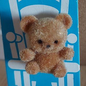 This little bear pin is fuzzy all over in light brown with dark eyes. Made in the 1970s or 1980s. Cute as a lapel pin or on a hat or backpack.